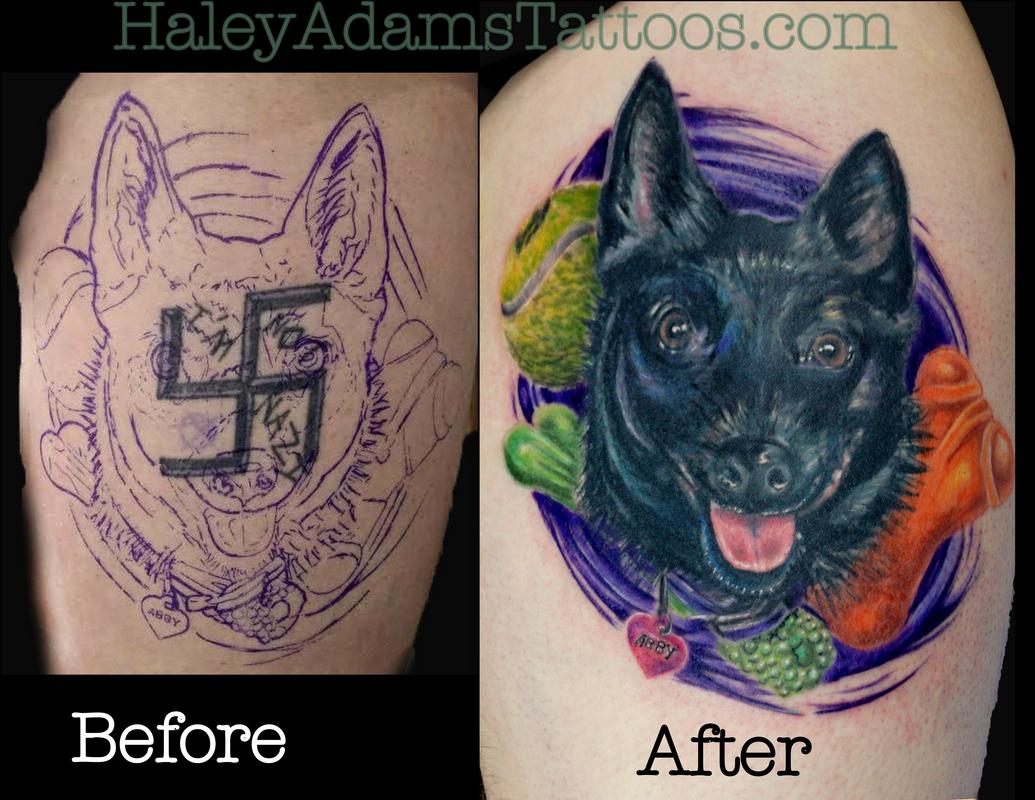 Before and after tattoo, cover up tattoo, san francisco cover up tattoos, dog portrait tattoo, animal portrait tattoo, tennis ball tattoo